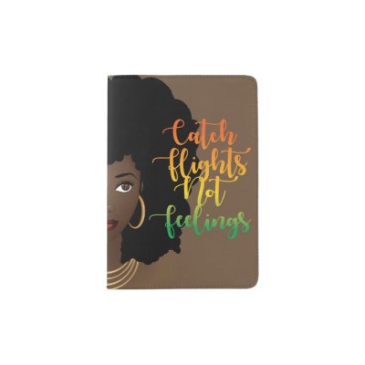 Passport Holder - This passport holder features the quote "Catch Flights Not Feelings" in a gradient of red yellow and green and a beautiful natural hair woman with a curly afro gold layered necklace hoops and red lips on a brown background. Perfect for those who love to travel and be unique. Great girls trip accessory! Get your passport holder to keep your passport like new and travel the world. ***MATCHING LUGGAGE TAG AVAILABLE IN THE TRAVEL COLLECTION*** myEverything