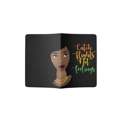"Catch Flights Not Feelings" Passport Holder - This passport holder features a beautiful natural hair woman with an afro beaded and gold jewelry and burgundy matte lips on a black background. Great girls trip accessory! Get your passport holder travel worldwide and let 'em know. ***MATCHING LUGGAGE TAGS AVAILABLE IN THE TRAVEL COLLECTION*** myEverything