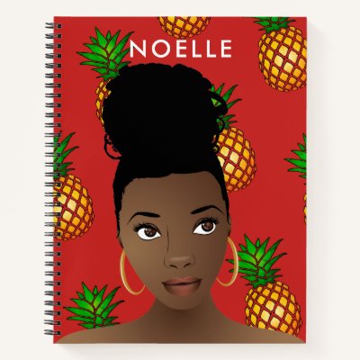 This design features a natural beauty with a top knot bun hair do on a backdrop of yellow pineapples on a red a background. Customize it with your name. myEverything