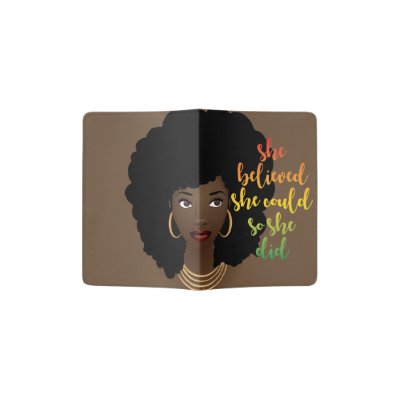 This passport holder features the inspirational quote "She Believed She Could So She Did" in a gradient of red yellow and green and a beautiful natural hair woman with a curly black afro gold layered necklace hoops and red lips on a brown background. Perfect for those who love to travel and be unique. Great girls trip accessory! Get your passport holder to keep your passport like new and travel the world. ***MATCHING LUGGAGE TAG AVAILABLE IN THE TRAVEL COLLECTION*** myEverything