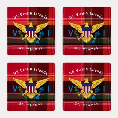 Red Madras Virgin Islands Flag USVI St. Thomas Coaster Set - Enjoy the Traditional Madras and Plaid Pattern with the US Virgin Islands Flag. Personalize it. Beautiful St. Thomas is located in the Virgin Islands and the Madras material has been a part of the culture. It is worn by Quadrille Dancers with their traditional hats and clothes while they dance to Quelbe music in the Caribbean islands. We hope that you will enjoy a part of island culture and showcasing the US Virgin Islands Flag. myEverything